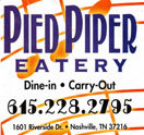 Pied Piper restaurant in Nashville is a family friendly diner located on Riverside Drive in South Inglewood near East Nashville. They have a rock-n-roll theme throughout the restaurant from the table tops to the restrooms. The menu at Pied Piper is amusing to read with musical names for their dishes. Around the East Nashville community they are known for their “Fleetwood Mac ‘n Cheese”, the “Fried, Sally Fried” dill pickle slices and “Bonnaroo’s Most Wanted” Vegetarian Burger. Pied Piper serves breakfast all day long with biscuits on Saturday and Sunday. They even have takeout but there is a small fee to offset their costs. East Nashville is known for their sense of community, which you see first hand at Pied Piper restaurant with all of the children in the place playing together at the train and toy table. Good food in a laid back atmosphere makes Pied Piper restaurant one of Nashville’s favorite places.